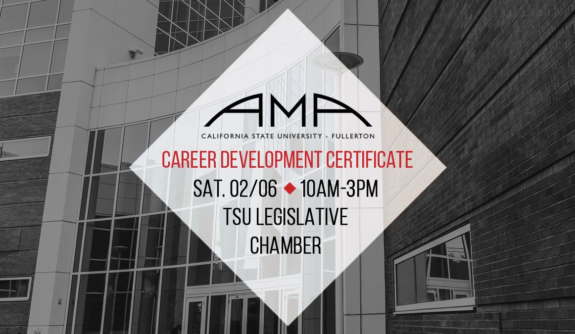 We know searching for that perfect internship or post-graduation job can be challenging and stressful. We also know that networking and career development are critical components for not only landing that dream job, but for long-term success. On, Saturday, Feberuary 6th, CSUF AMA is presenting the AMA Career Development Certificate Program to help you develop the skills and knowledge you need to market yourself in the best light.