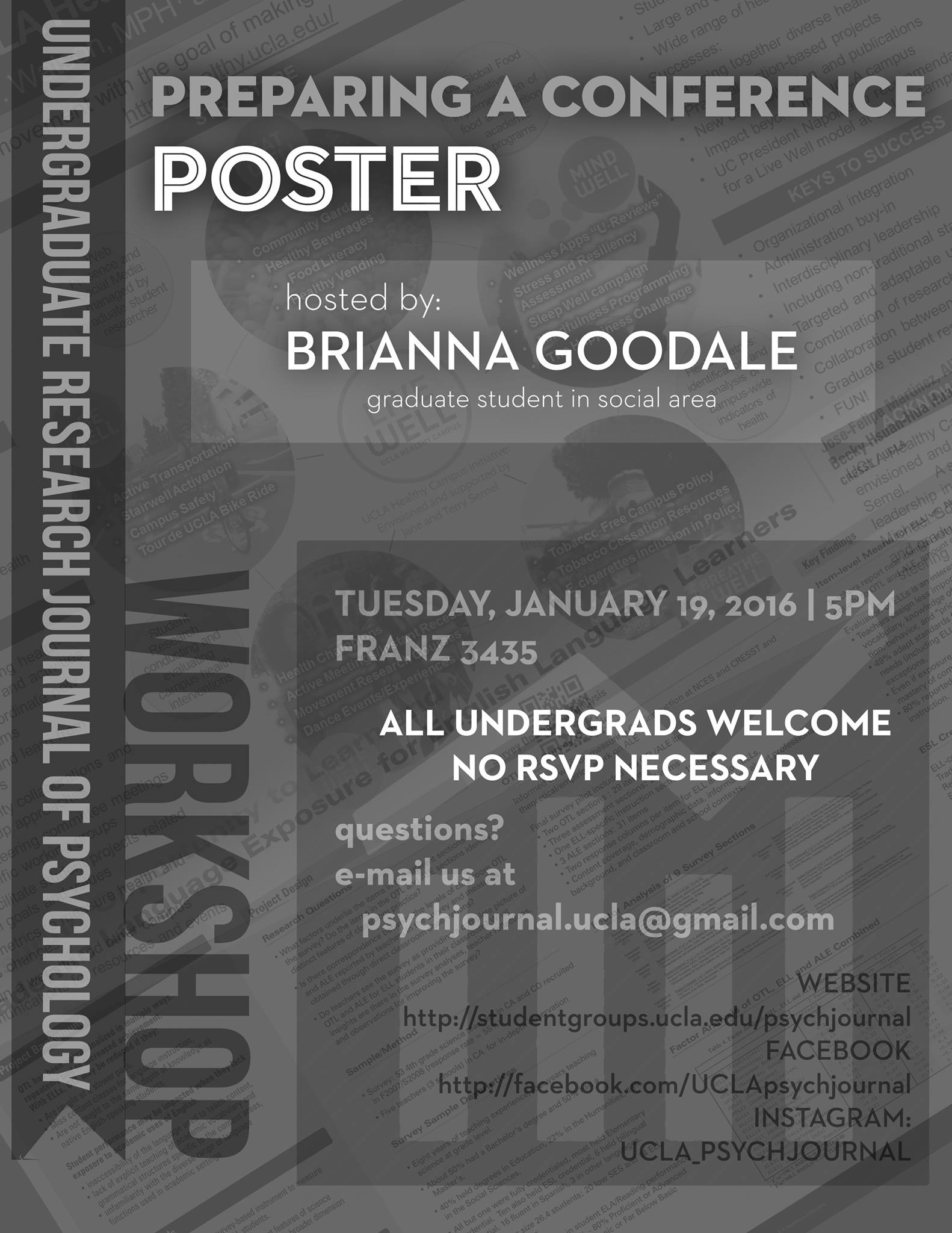 Are you working on or have completed a research project? Do you want to present your work at an upcoming conference? The URJP is hosting a workshop on "Preparing a Conference Poster" to help you get started. Come learn from a graduate student about what goes into the making of a conference poster (tips, tricks, and all your questions answered)! ALL STUDENTS WELCOME, No RSVP required.